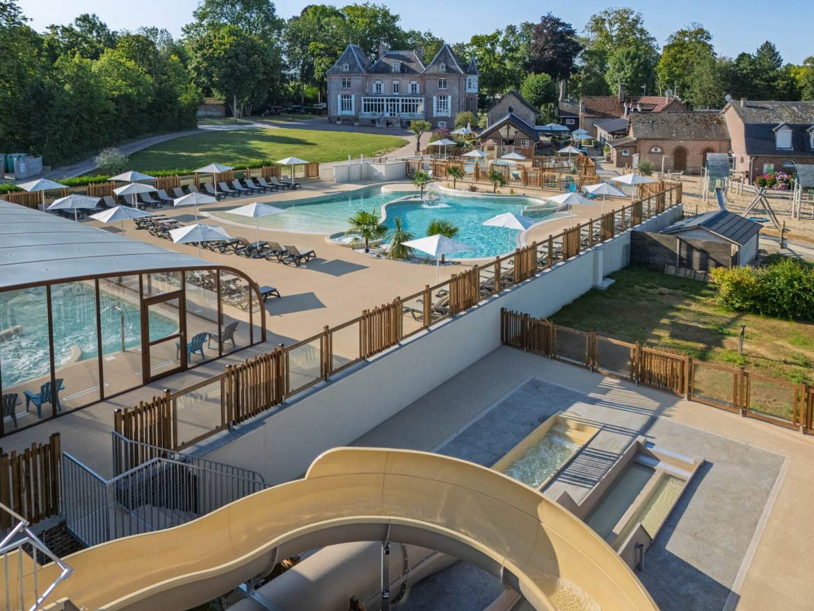 A covered swimming pool and water park in Estrébœuf